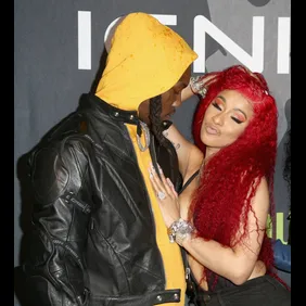 At a pre-Valentine's Day party last night, Cardi B was among the attendees with her hubby Offset. While they were posing for photos, the superstar made sure to not wear gloves, as she had at the Grammy's earlier that week. Instead, her ring was on full display with her showing it off proudly next to her man.