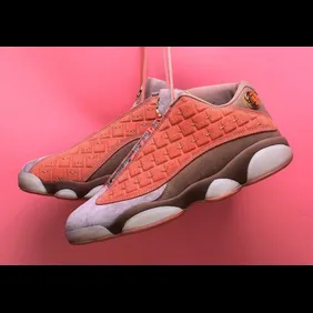 As seen in Sylvester's video, the premium Air Jordan 13 Lows are highlighted by a brick-like suede that covers much of the upper along with hits of grey and olive suede on the toe, tongue, midsole and heel. Additional details include metallic gold Jumpman and CLOT logos on the upper ankle and tongue.
