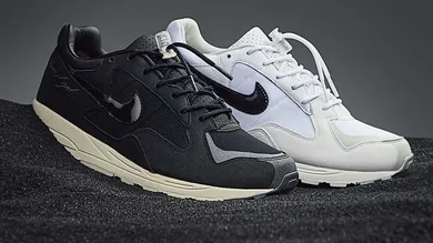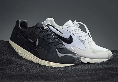 The FOG x Nike Air Skylon II is offered in two colorways: "White/Black-Light Bone" and "Black/Sail-Fossil." The early 90s running sneaker comes equipped with a luxurious leather inner lining and a new toggle lacing system as well as glossy, black patent leather swooshes and Fear Of God script near the heel.