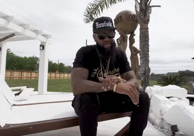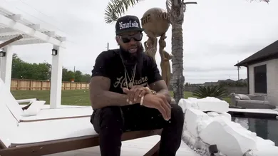If there are any Slim Thug fans out there that have wondered how the rapper lives, in the visual for "KOTH" he takes you on a tour of his vast property. He spits rhymes as he sits next to his blacked-out pool in an outside area with all-white decor. He walks past his black-on-black luxury cars to take viewers inside where shows off his living room and shoe collection.