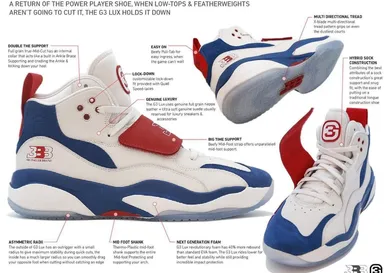 The graphic posted to the Big Baller Brand Instagram account shoes off a chunky design specifically tailored to LiAngelo's play style. An all-white leather upper with hints of blue suede and a red leather strap makes the shoe stand out. There is also a translucent outsole and double the support at the cuff so your ankles stay secured.