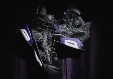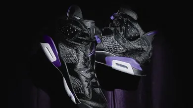 The unique 6s are built on a hairy black upper, inspired by MJ's "Black Cat" alter ego, along with hits of dark concord as a nod to the Hornets.