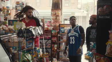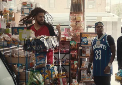 The music video shows the trio making a slow-motion entrance into a bodega, while the lovely Argo Sisters sample plays. Cole seems to take on a big brother role as his starry-eyed and significantly shorter peers, DaBaby and Lute, trail behind him. Cole interacts with the cashier, ordering the crew some mustard-drenched meat sandwiches. The camera zooms in on DaBaby enjoying a mouthful before flashing one of his wide, infectious grins. The rest of the video shows the rappers roaming about town as they deliver their verses in various locations.
