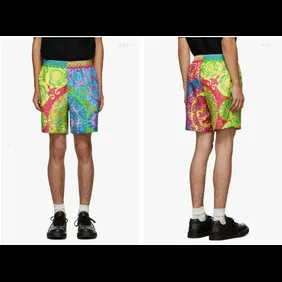 The first pair featured from the renowned Italian fashion house, sport a vibrant colorblock pattern of blue and yellow, with pink Baroque detailing running down the length of the shorts and around the the waist. The mid-rise French terry shorts also feature an elasticized waistband, a mock-fly and two pockets. The pair retails for $850 USD.