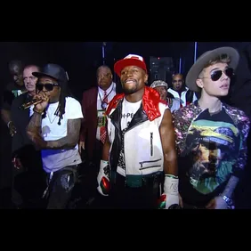 Mayweather's procession to the ring also included some clowns, jugglers and other circus-related characters, only adding to the spectacle. Later, he got Tyrese to sing the national anthem alongside Rev Run and Diggy Simmons. Below, watch a video of Weezy and Bieber walking Mayweather to the ring, via World Star.