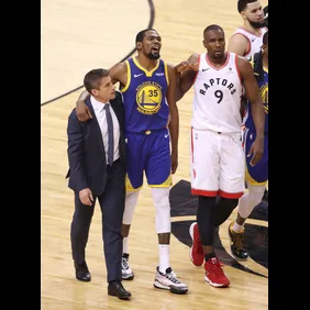 It was his triumphant return to the court after sitting out the end of the Playoffs and the first four games of the Finals, and many questioned whether Kevin Durant was fully recovered from his injuries. During his Finals debut, Durant's right leg gave out on him and he sat on the court for a moment before he stood up and walked with a limp. He was escorted to the locker room with the help of the Golden State Warriors Director of Sports Medicine, Rick Celebrini.