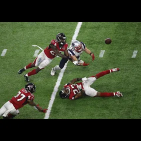 With the Patriots trailing the Falcons 28-20 and the two minute warning rapidly approaching, Tom Brady threw a pass over the middle which was tipped, and then, somehow, corralled by a diving Edelman for a 23-yard gain.
