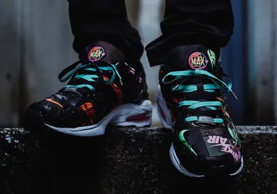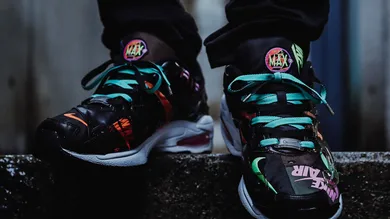 Just like the first iteration, the upcoming black colorway takes inspiration from Nike apparel in the ’90s and the vibrant upper is a twist on the bright, bold gear synonymous with that era. A swoosh or “NIKE AIR” branding is printed or embroidered on every piece of patchwork, and each shoe features asymmetrical patterns.