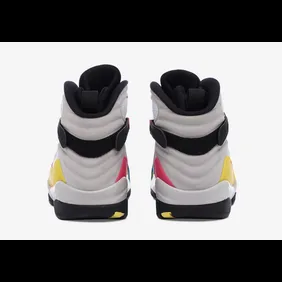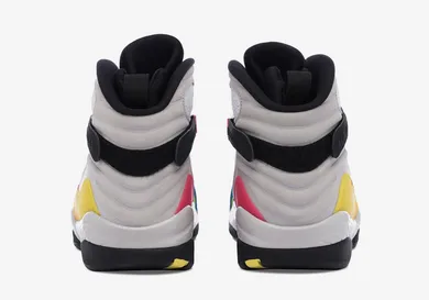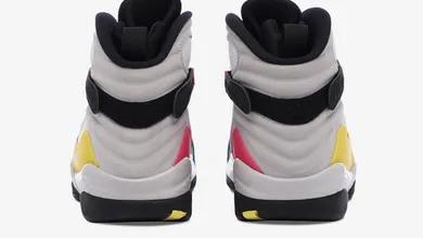 The kicks are patently ridiculous, featuring semi-translucent pink and blue straps that swipe across the black tongue and laces in classic Air Jordan 8 fashion. The silhouette is also highlighted by splashes of yellow throughout, with all three of the neon flavors combining on the chenille tongue logo.