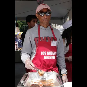 For this year's Good Friday, Pharrell Williams and his son Rocket have made their way down to Los Angeles' Skid Row to serve up some hot meals for those less fortunate. The meal is an annual tradition for the Los Angeles Mission where the homeless also get shoes and an Easter basket. TMZ reports that his year, about 4,000 people were fed pork with an apple glaze, King's Hawaiian rolls, a side of mac and cheese and peach crisp for dessert.