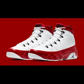 The kicks feature a smooth, white leather upper equipped with a glossy, gym red patent leather finish on the overlays. The 9s also feature hits of black on the eyelets, heel tab and Jumpman branding on the tongue and midsole.