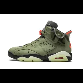 The olive Cactus Jack 6s come equipped with a button enclosed stash pocket on the ankle collar, along with red accents throughout, including the "Nike Air" and Cactus Jack branding on the heel.