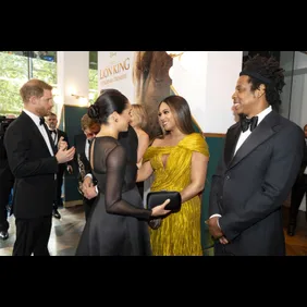 At Sunday's premiere of The Lion King in London, there was not one, but two royal couples in attendance as Prince Harry and Meghan Markle met Jay-Z and Beyonce for the first time. According to Daily Mail's Rebecca English, the couples exchanged words along the topic of the parenting life as Beyonce reportedly complimented the Duchess on her and Harry's "beautiful" baby, adding that she and Jay "love you guys."