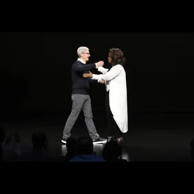 Apple CEO Tim Cook met Oprah on the stage where a few tears were shed. "Thank you Oprah, I will never forget this," he told her.