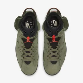 The "Cactus Jack" 6s come equipped with an olive green nubuck accompanied by black detailing, a sail-colored midsole, and a glow-in-the-dark outosle. Additional details include a button enclosed stash pocket on the ankle collar and University Red accents that appear throughout the silhouette, including the Jumpman branding on the tongue, as well as the Nike Air and Cactus Jack branding on the heels.