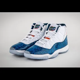 As seen on the feet of Mullen during SEC Media Day earlier this week, the custom Florida Gators Air Jordan 11 features a white upper with a blue gator design on the patent leather overlay. Additional details include the Gators logo on the tongue and Mullen's initials on the heel.