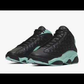 The "Island Green" 13s are highlighted by a textured black leather upper, accompanied by suede "Island Green" overlays in all the familiar places. The kicks also come equipped with chrome detailing on the Jumpman logos on the tongue as well as a "23" badge in place of the traditional hologram on the outer ankle. Overall, the color scheme is reminiscent of the iconic Tiffany Nike SB Dunks.
