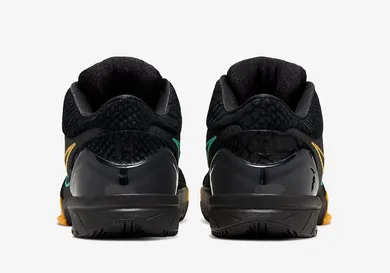 Featuring a "Black/Aurora Green-University Gold" color scheme, this all-new Kobe 4 Protro is highlighted by the snakeskin detailing on the toe, tongue, ankle collar and heel, as well as split Nike swooshes and Kobe logos.