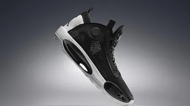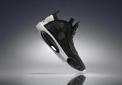 Each pair of 34s will also feature a different logo design on the heel, and this black and white colorway is highlighted a Jumpman "Eclipse" on the heel, hence the sneaker's moniker.