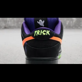 The Dunks come equipped with a number of holiday-themed elements including Jack-o'-lantern perforations on the orange leather toe box, purple web detailing and the words "Trick" and "Treat" on the left and right heel, respectively. Additional details include a ghost logo on the inside of the tongue, a slime green outsole, and insoles decorated with pumpkin guts.