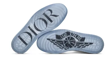 "Made in Italy to superlative standards, the silhouette is created with the fine calf-leather that characterizes Maison Dior’s leather goods, edge-painted and dressed in Dior Gray, a color synonymous with the Maison since its founding in 1947. A remix of the iconic Jumpman Wings logo is embossed on the upper and features the words “AIR DIOR." The Nike Swoosh is executed in Dior Oblique jacquard, a single motif simultaneously representing both industry leaders. The same Dior motif is scaled down and laser-etched into the insoles at a 50 percent scale."