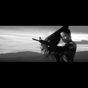 For Nicki Minaj's “Lookin Ass Nigga” visual, the femcee headed to a frozen lake in the middle of nowhere. Posing for the camera as if she was in a photo shoot, Nicki madly raps about always being looked at. It’s ironic, yes, but also brilliant. To cap it all off, she fires rounds of an assault rifle into the distance: hot and dangerous.