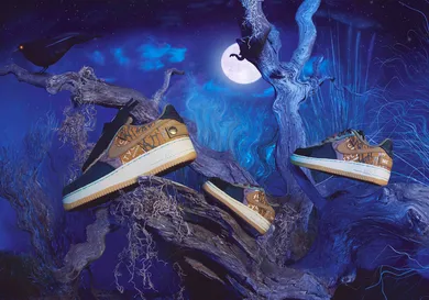 The 2019 collab is much busier than the two that dropped in 2017 and 2018, as it features a patchwork design highlighted by a combination of materials including leather, suede, canvas and corduroy. The kicks are also decked out in a dizzying array of colors such as gold, purple, navy and black, with a zip-up shroud covering the tongue and laces.
