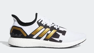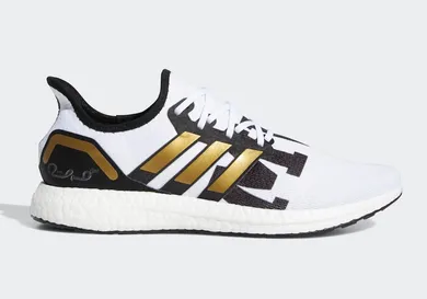 Dubbed the "Showtime Mahomes" Adidas AM4, the special edition sneaker comes equipped with a pristine, white primeknit upper, highlighted by metallic gold three stripes branding and bold "MVP" text stamped across the upper in black. Additional details include a black sock liner and a heel tab etched with Mahomes' signature, as well as a white, cloud-like Boost midsole sitting on top of a black rubber outsole.