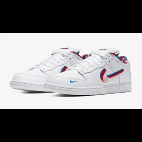 The kicks consist of a white leather base accompanied by shades of red, pink and blue around the inner lining and tongue tag. Additionally, they come equipped with three overlapping chenille Nike swooshes in red, pink and blue, with matching "SB" and "PARRA" branding on the heel tab.