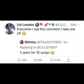In typical Uzi fashion, he sent out a peculiarly-formatted tweet announcing the length of Eternal Atake. "16 songs ....," he wrote. While sixteen songs seems like a substantial run-time, some fans are not fully satisfied, given the protracted delay of this project. "2 years for 16 songs [upside smile emoji]," one person complained. Uzi called out this follower for the ungratefulness and launched a threat in return: "Everytime I see this comment I take one off [upside smile emoji]." He has since deleted that tweet, but just to play it safe, don't pester Uzi.