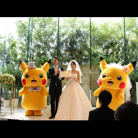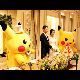 A Japanese company called ESCRIT that specializes in wedding planning has teamed up with The Pokemon Company to offer officially licensed Pokemon wedding ceremonies. The wedding package includes two lifesize Pikachu mascots that stand next to the bride and groom, possibly as a groomsman and a bridesmaid. However, that's not all they offer that's Pokemon themed. Additionally, the food is also Pokemon themed including a soup that has the design of Pikachu's tail.