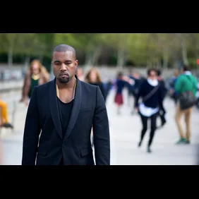 Rocking some black leather pants, and a camel wool blazer, Yeezy tones his style down by losing the big chains, and keeping things more simplistic with a white tee and sleek chain. A look we've seen him pull off and embrace a lot lately.