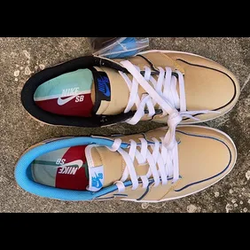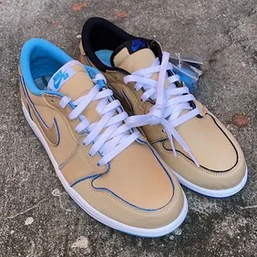 As seen in the latest batch of images, the upcoming Air Jordan 1 Low SB will feature a "Desert Ore/Royal Blue/Dark Powder Blue" color scheme with mismatched detailing on each shoe. For instance, the right shoe is highlighted by powder blue piping and a matching inner lining while the left shoe has black and royal blue accents.