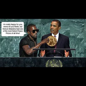 When Kanye was a guest on Late Night With Seth Meyers, together they took a look back at one of his hilarious skits on SNL where Kanye interrupted several different situations (all in homage of that Taylor Swift gatecrash). Ye happily took part in the sketch disrupting the Nobel Physics Awards, and a pumpkin contest. We'd include more footage of these skits, but we couldn't find them.
