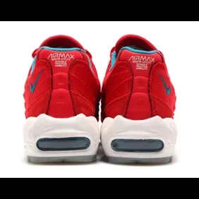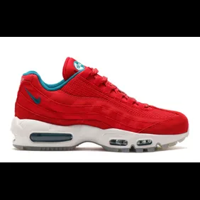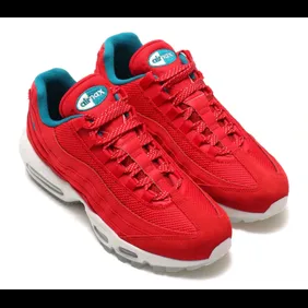 This sneaker is being dubbed the Nike Air Max 95 "Mt. Fuji" as it pays homage to the tallest mountain in Japan. This sneaker has a red upper while teal accents are placed on the Air Max branding on the tongue, the Nike swoosh on the sides, and even the cuff and sock lining. On the back heel, the sneaker notes that this Air Max 95 has winter durability which lets you know these materials are pretty fortified.