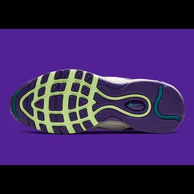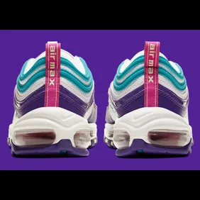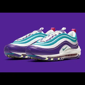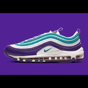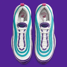 This latest colorway looks like it would be perfect for a player on the Charlotte Hornets. As you can see from the official images below, the shoe has a white upper with a purple leather ring that wraps around the entire silhouette. From there, two teal rings are placed further up on the upper, closer to the tongue. If you're a Hornets fan, this might be the closest you will ever get to an official Hornets Air Max 97.