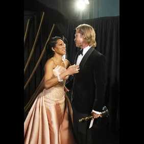 Brad Pitt and Regina King may not be dating but fans want that to happen after seeing how close they got at the Academy Awards this weekend. Among many other special moments, including Parasite's total domination, Eminem's surprise performance of "Lose Yourself," and more, one of the most heartwarming Oscars 2020 bits came as Brad Pitt and Regina King were making their way off the stage and into the press room. Pitt won the award for Best Supporting Actor for his role in Once Upon A Time... In Hollywood and as they made their way to the backstage area, they appeared to be very chummy. At the time, a ton of affection could be seen on camera but even after, they seemed to be feeling each other, holding hands and even planting some kisses on each other's cheeks. It's got fans of both actors hoping that they continue their bond outside of the awards ceremony.