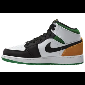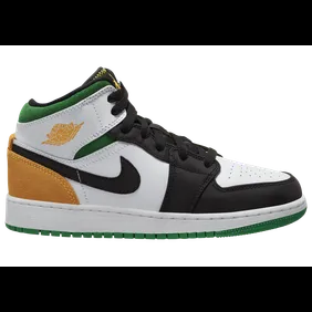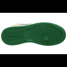 Now, the Air Jordan 1 Mid is getting one of those colorways with this Supersonics-inspired model, below. The shoe is coming in grade school sizes and features all of the Supersonics colors you know and love. As you can see, the toe box and side panels are white while the overlays and Nike swoosh are black. From there, the cuff of the sneaker is green and the back heel is yellow.