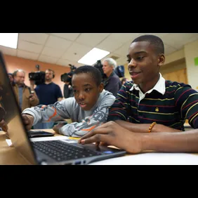 Reuters is reporting that New Mexico Attorney General Hector Balderas is suing Google parent company Alphabet Inc with allegations that the search engine's educational software has been collecting personal data without consent from the likes of many young students. Kids across the nation have been relying on Google's highly popular Chromebook laptops for years now, as seen above in the picture of two students working off Chromebooks gifted by Google to their school, Mildred Avenue K-8 School, back in 2014. Google has responded by calling the allegations "factually wrong," although they stopped short of responding to a request to elaborate. The software in question is the free or low-cost G Suite for Education software package, which comes with email and writing tools.