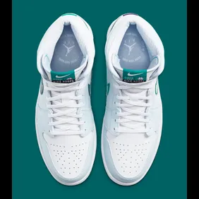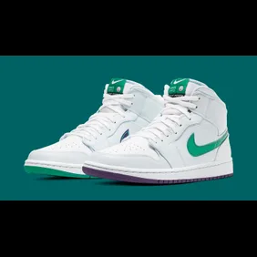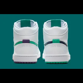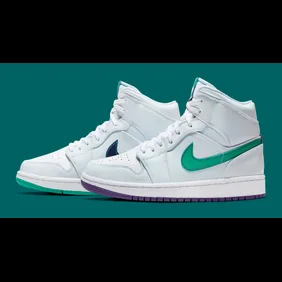 Jumpman is doing this with an Air Jordan 1 Mid that has brand new "Nike Hoops" branding on the tongue. As you can see, there is a Nike swoosh, basketball logo, and some writing that says "Since 1972." In terms of the actual sneaker, there is a white leather base and some light blue overlays that help add some lowkey contrast. From there, the left shoe has green Nike swooshes and a purple outsole. The right sneaker features an opposite aesthetic as it has purple swooshes and a green outsole.