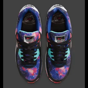 As you can see from the photos below, the shoe features numerous vibrant colors with a stary vibe that is reminiscent of other "Galaxy" Nike colorways. The infamous Foamposite from the last decade certainly comes to mind in that regard. Overall, this is yet another collectible Air Max 90 that will make the hardcore sneakerheads out there, very excited.