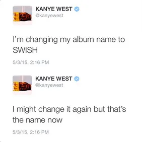 In true Kanye fashion, he warned us he "might change it again." For now, though, SWISH it is. This isn't the first time we've seen Yeezy throw out a SWISH on Twitter. In mid-March, Kanye tweeted out eight pictures of his naked wife from a yet to be released photo shoot, and wrote "SWISH" (with several exclamation points) on half of them.