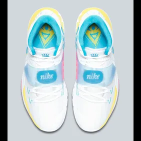 The shoe carries a vintage aesthetic with neon colors like blue, yellow, and pink, set on top of a white base. As for the Nike swoosh, we have a layered aesthetic that sees a blue swoosh on top of a yellow one. There is even a blue pinwheel of swooshes on the medial side of the sneaker. Overall, it's a lovely colorway that will look incredibly flashy on-foot.