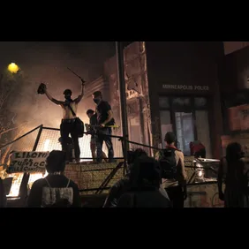 Protesters gather in front of the 3rd precinct police building while it burns in Minneapolis, Minnesota - Stephen Maturen/Getty Images