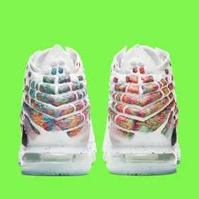 One of the things that were apparent from the previews was the fact that the shoe had some vibrant colors on the knitposite upper. The base color of the shoe is white all while neon greens and other 90s aesthetics are placed all throughout the sneaker. Overall, this makes for a dope colorway that will certainly play on people's nostalgia. If you need something for the court that will immediately get people's attention, these will certainly be a great pick up.