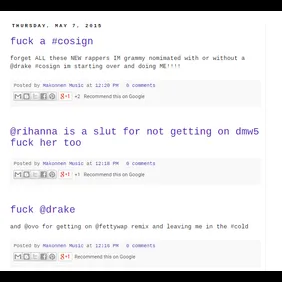 Makonnen's account tweeted "Fuck Drake" before accusing the rapper of leaving him in the cold and co-signing Fetty Wap. Rihanna was then targeted for allegedly pulling out of her feature on Makonnen's latest mixtape, going on to call her a "slut" (which doesn't seem very Makonnen-like at all).