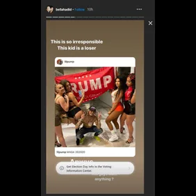 Over a photo taken from Pump's Instagram where he poses in front of a Trump MAGA flag, Bella wrote, "This is so irresponsible. This kid is a loser." She also shared a video that showed Trump introducing Lil Pump at his rally, calling the rapper a "superstar" and asking the crowd if they were familiar with him. A woman sitting behind Trump makes a face and the caption to the video reads, "You know he’s losing the plot when even Karen can’t relate."