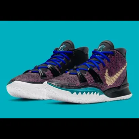 The latest 2021 CNY model to be shown off is the Nike Kyrie 7 which can be found below. As you can see, the colorway is quite extravagant as the upper is black with purple dots all the way throughout, all while the laces are blue. From there, the Nike swoosh as a unique gold pattern to it that lends itself to the CNY aesthetic. There is also some teal on the midsole and the tongue, which creates even more contrast throughout the silhouette. Overall, it's a unique color scheme that fits in nicely with the other Nike CNY sneakers.