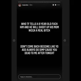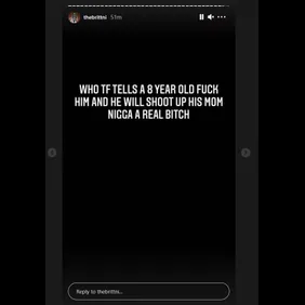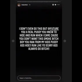 She deleted the video footage, however, it was quickly picked up by The Shade Room. Brittni returned with an explanation, claiming that Future showed up at the party but allegedly disrupted the festivities when he told his son "f*ck him," according to the angry mother. "I don't even do this but @Future you a real p*ssy you knew to hide and run when I came cause you don't want this smoke b*tch boy you ran from my kids p*ssy ass how!! Run like yo scary ass always do b*tch!" Brittni penned on one Instagram Story slide.