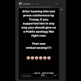 "After hearing this last press conference by Trump, if you supported him in any way you should give us a Public apology like right now," she wrote on her Instagram Story. Then, she added a stream of clown emojis and added, "That was embarrassing!!!!" It's unclear if her father is included in that group, but we'll just have to see if he responds. Check out her post below.